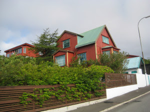 Aga siis läheb Tinghúsveguri kalle äkki väga järsuks. Tagaplaanil näha suure korstnaga mitmekorruseline „maja“ on täna sadamasse jõudnud ristluslaev, mätaskatuselise maja kõrvalt pöörab vasakule mäkke tänav nimega Gripsvegur.